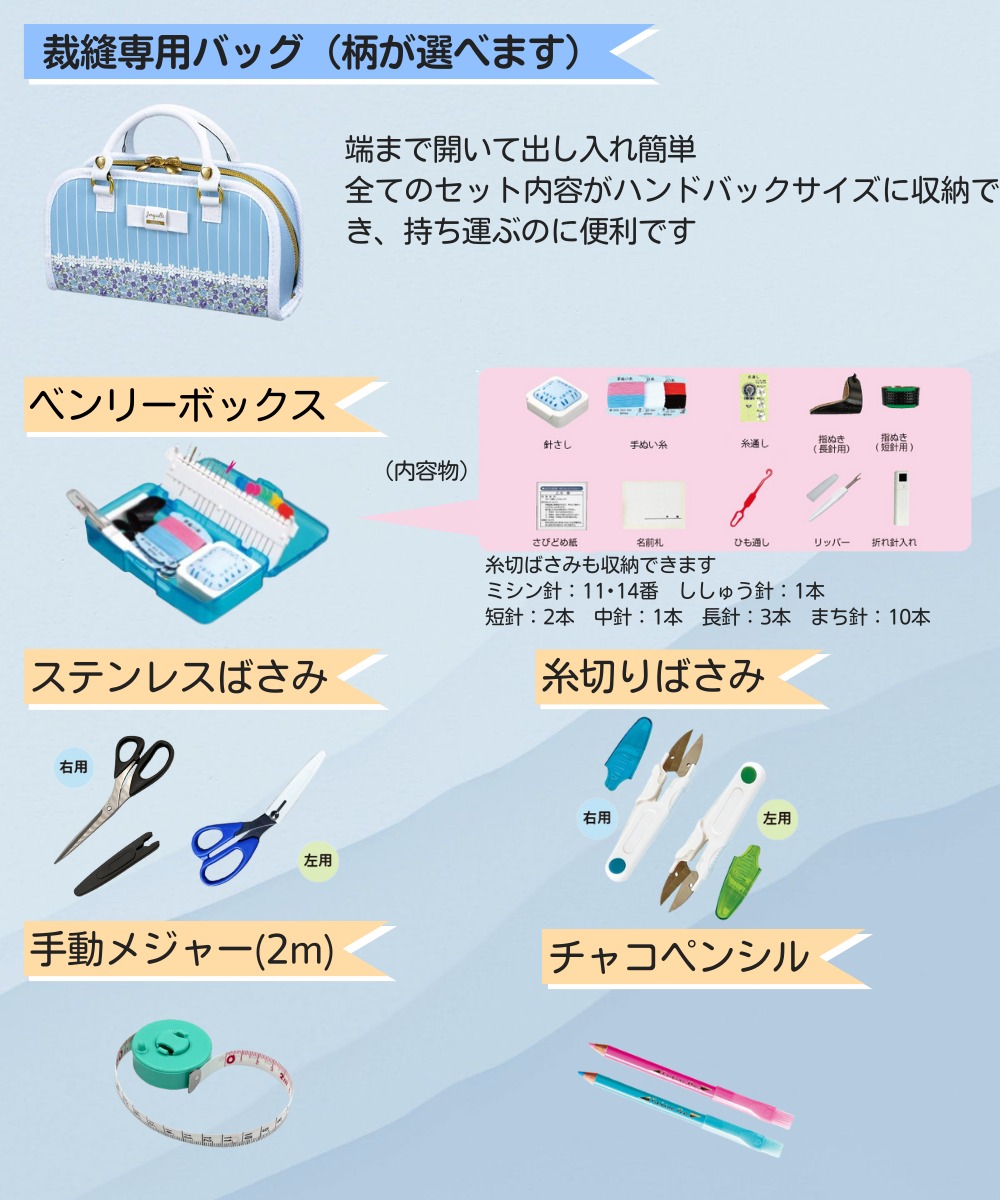 裁縫道具をハンドバック一つのコンパクトなセットで揃えることができます。セットに入っている「ベンリーボックス」は自社オリジナル品で工夫を凝らした仕様になってるのはもちろんのこと、安全に配慮した設計となっておりますので安心してご使用いただけます。※用具単品の販売もございます。
